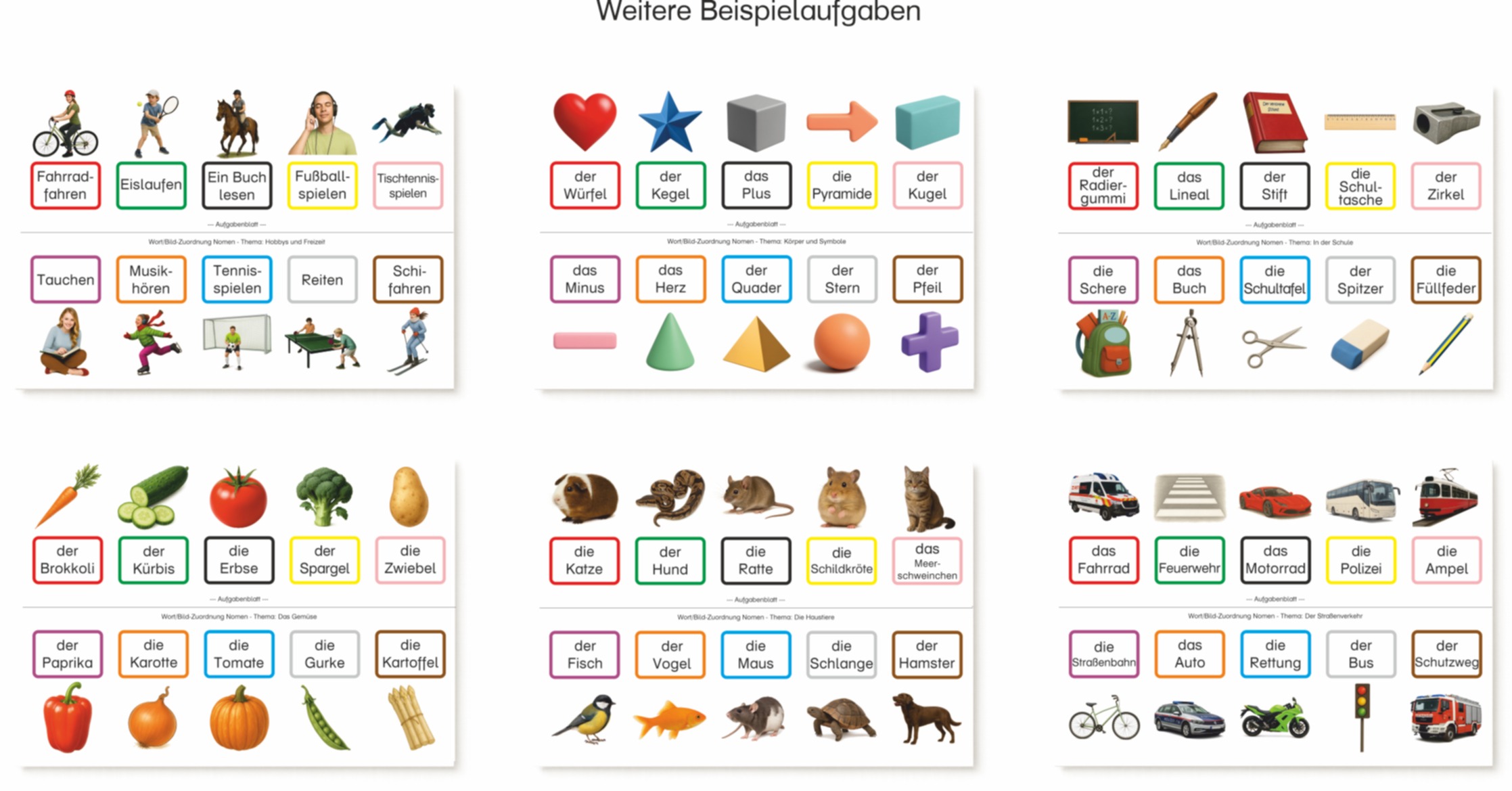 Das Gemüse – Das Obst – Die Kleidung – Die Berufe – Die Lebensmittel – Die Bauernhoftiere – Die Haustiere – In der Schule – Unser Zuhause – Hobbys und Freizeit – Körper und Symbole – Die Zahlen von 1 bis 10 – Die Körperteile – Der Kopf – Verben – Adjektive – Leseverständnis Präpositionen