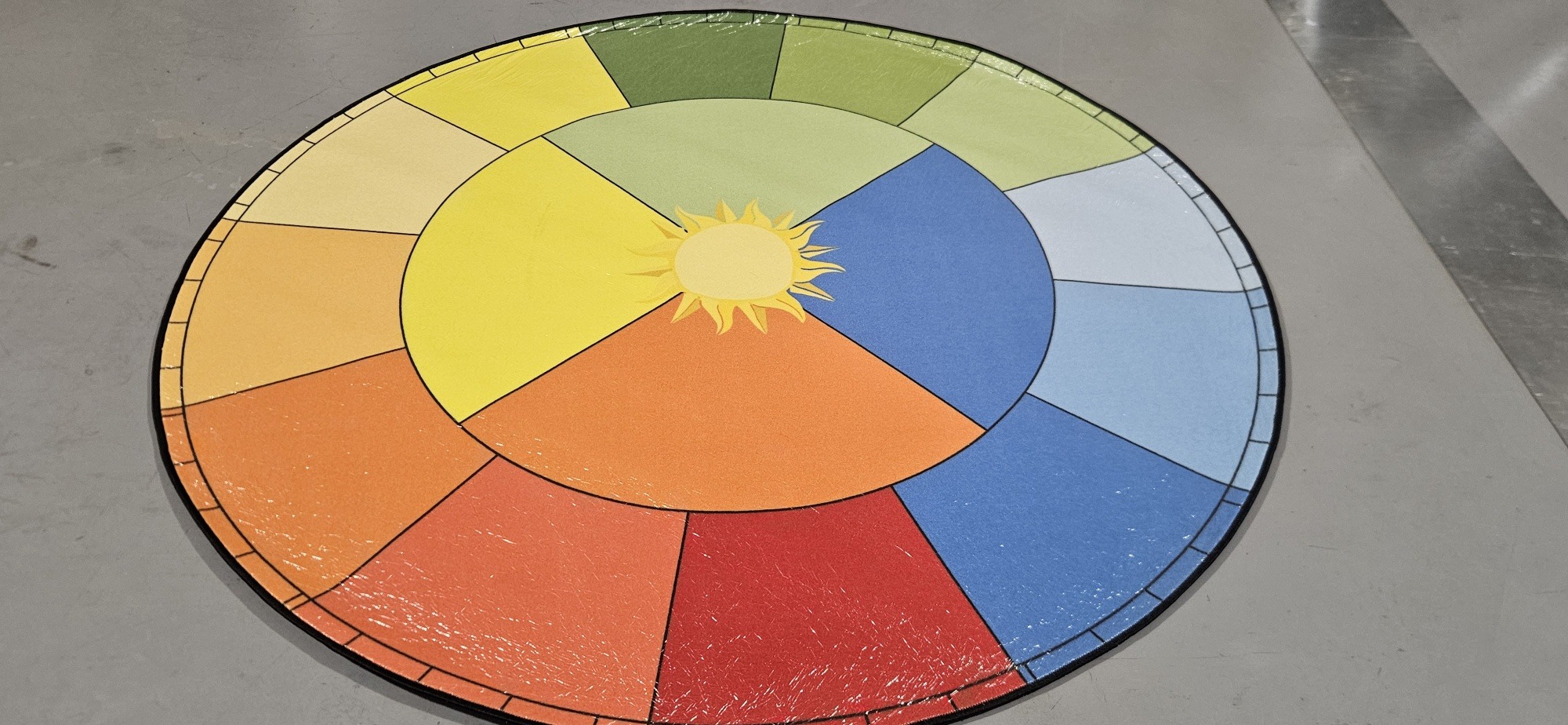 Bei diesem Lernteppich Jahreskreis fehlen am äußeren Rand die Einteilungen für die Tage, daher hat dieser Teppich einen Durchmesser von ca 190cm.