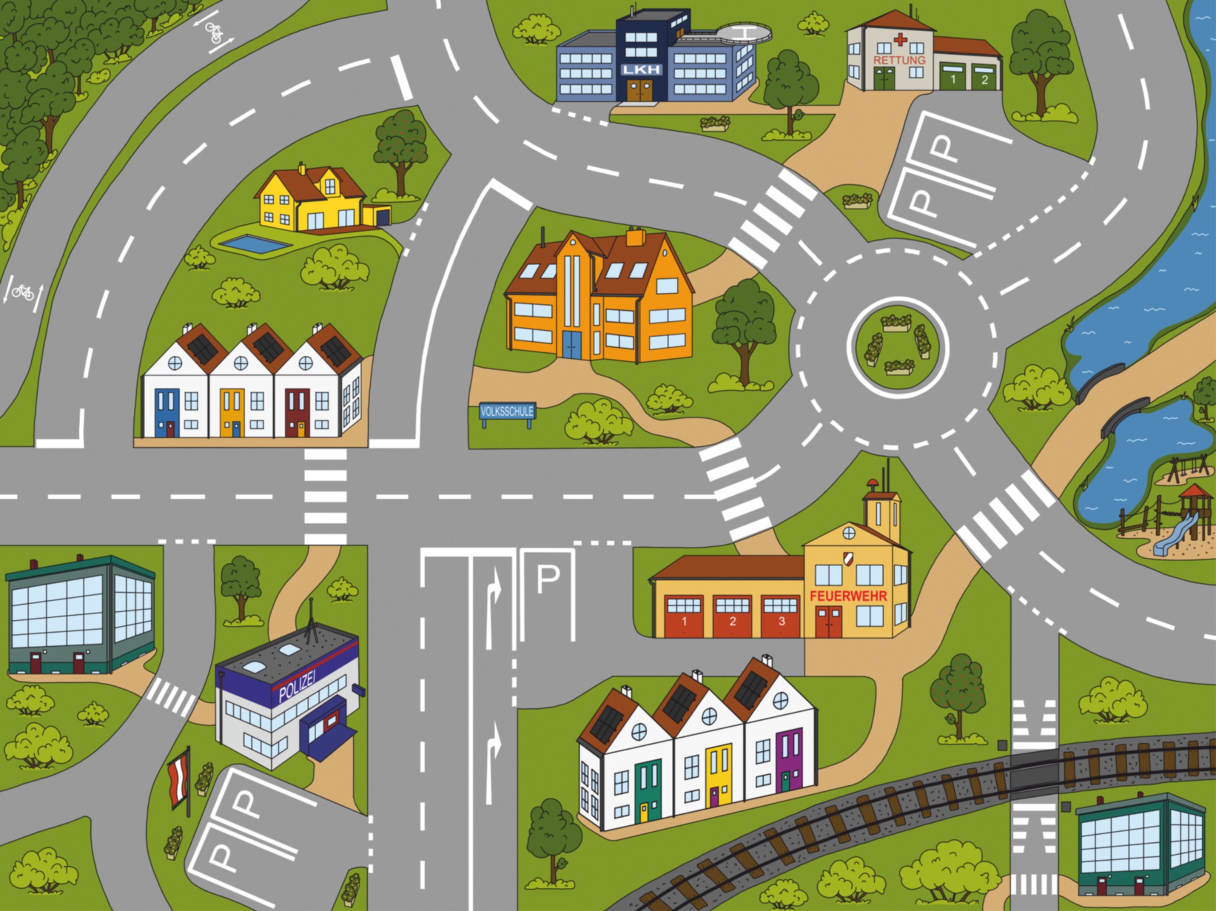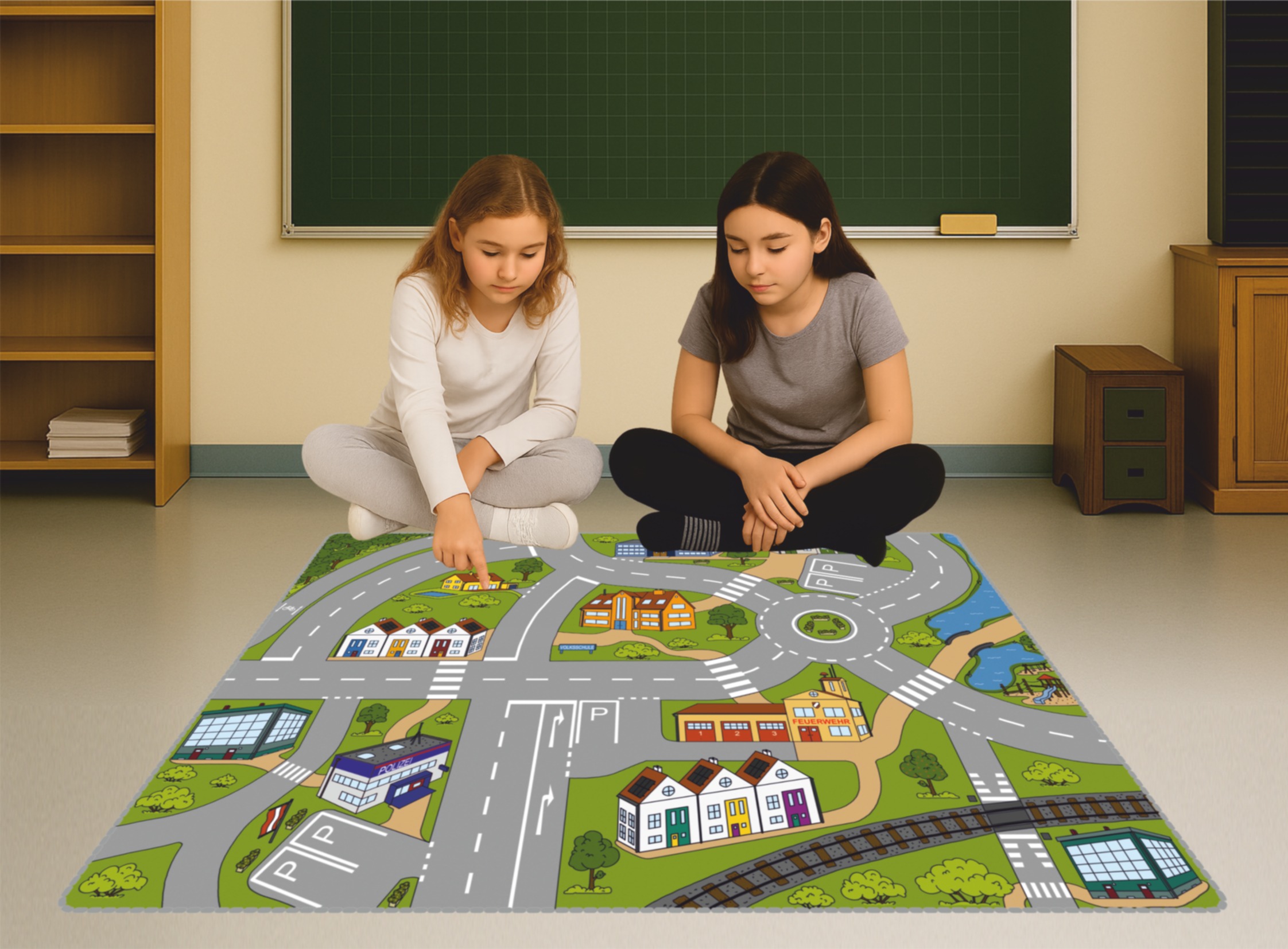 Dieser Verkehrsübungs- Lernteppich veranschaulicht den SchülerInnen die Verkehrsregeln.